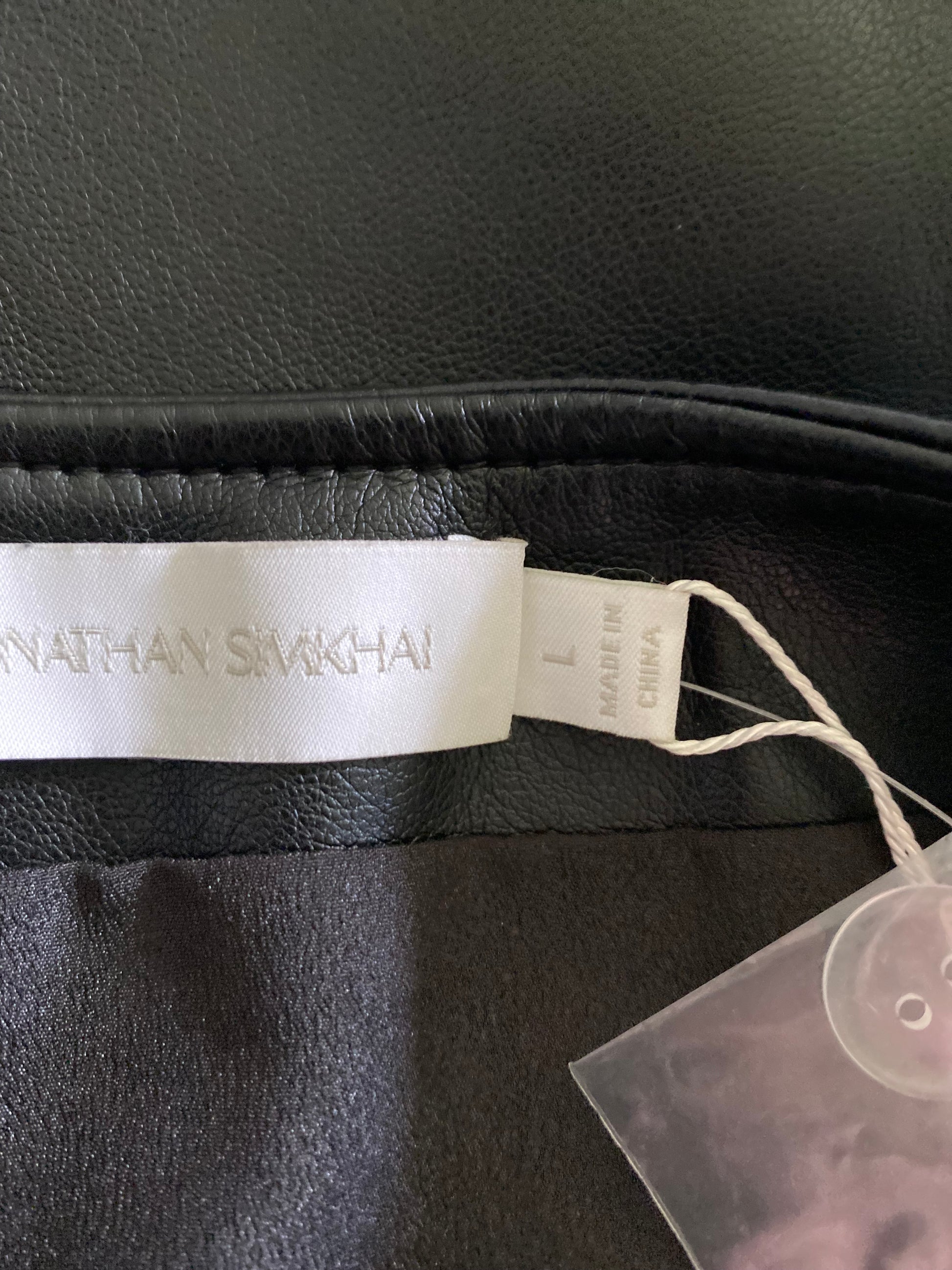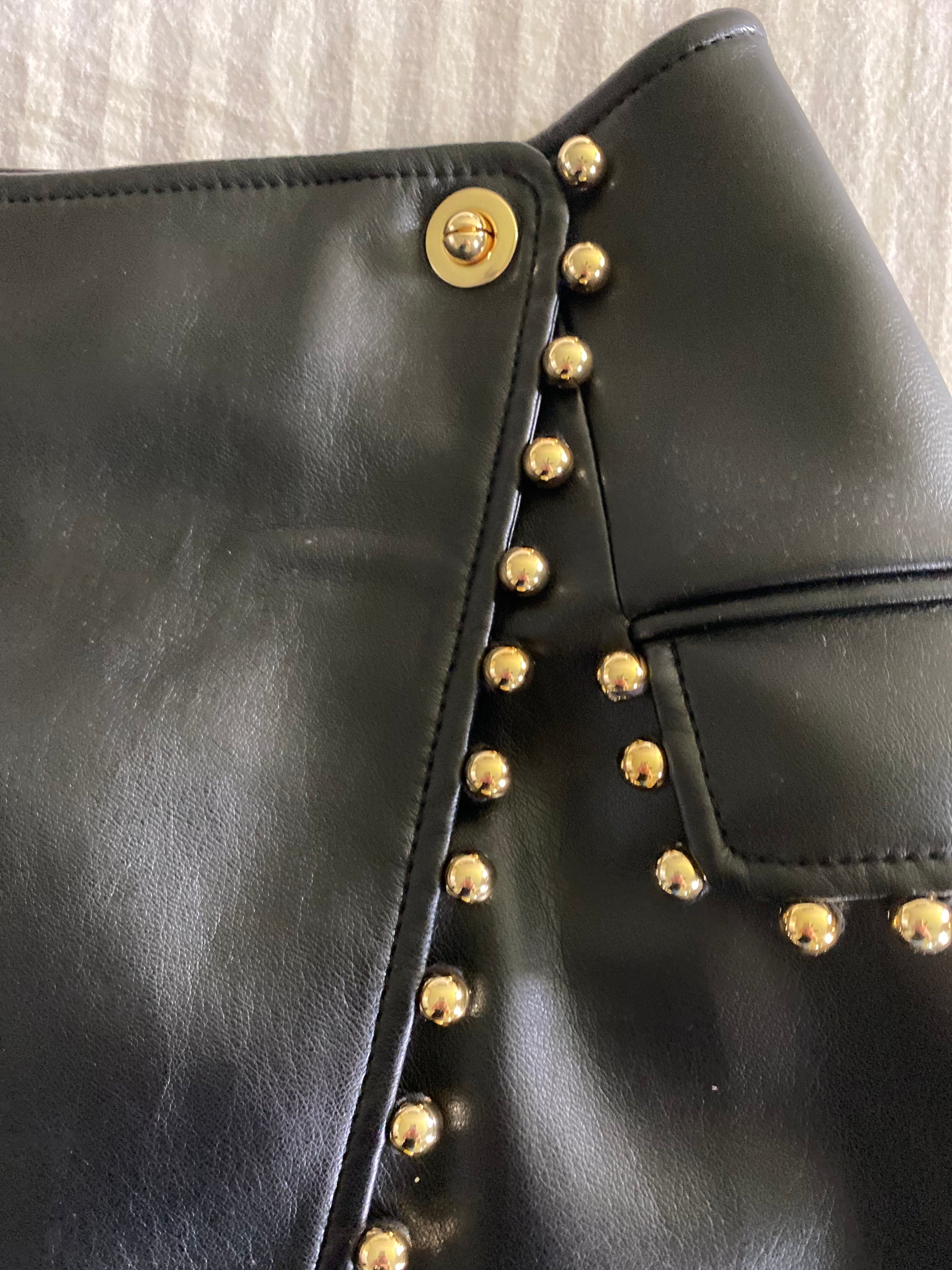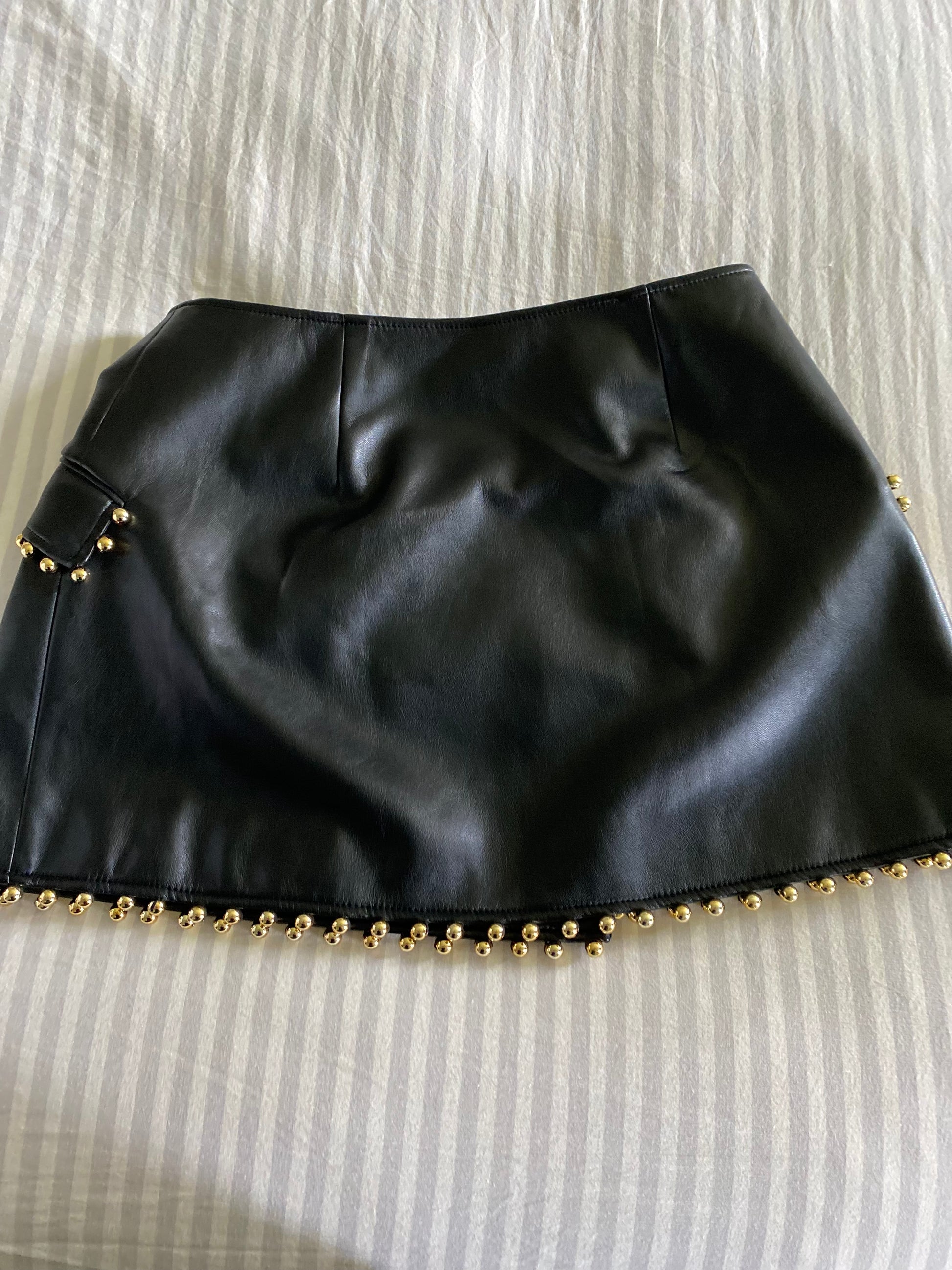 Crafted from soft buttery vegan leather, the JONATHON SIMKAI Clayton Mini Skirt in size L offers a modern, eco-conscious style. Featuring a sophisticated cross-front design and detailed with elegant gold ball studding, this black skirt blends edgy accents with classic tailoring. Ideal for those seeking a versatile, cruelty-free wardrobe staple that stands out with subtle luxury. New with tags, it’s perfect for elevating both casual and dressy looks. #100
